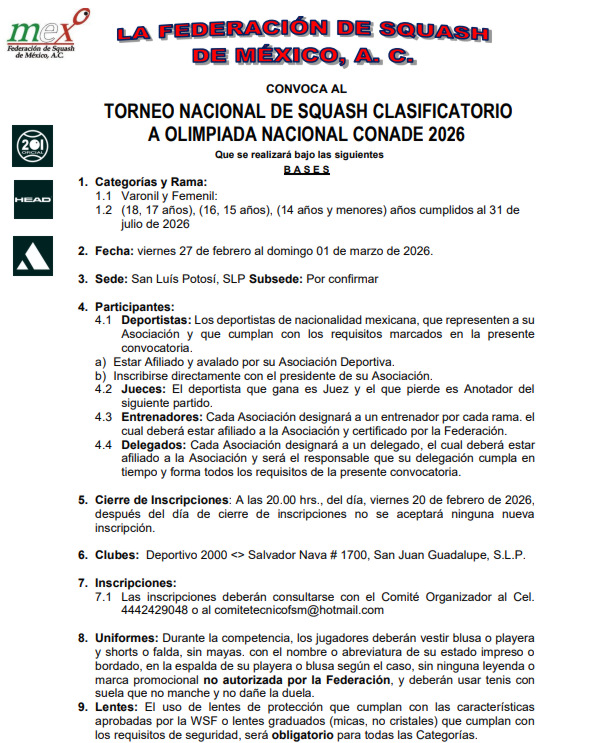 Torneo Nacional de Squash Clasificatorio a Olimpiada Nacional CONADE 2026